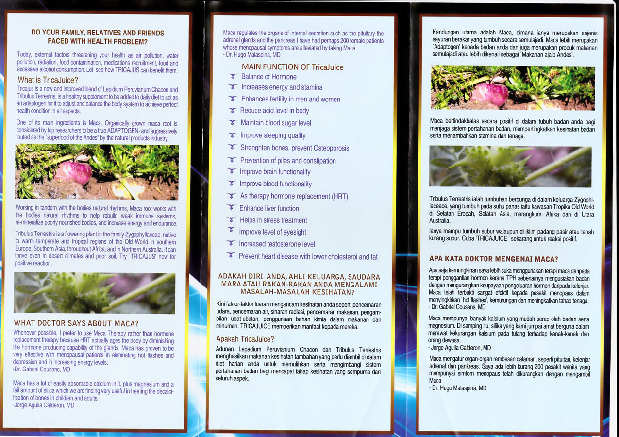 TricaJuice contains maca which is very useful to increase energy, stamina, athletic performance, impotence relief, fertility enhancement, male menopause, erectile dysfunction, hormone balancing and increased testosterone level.